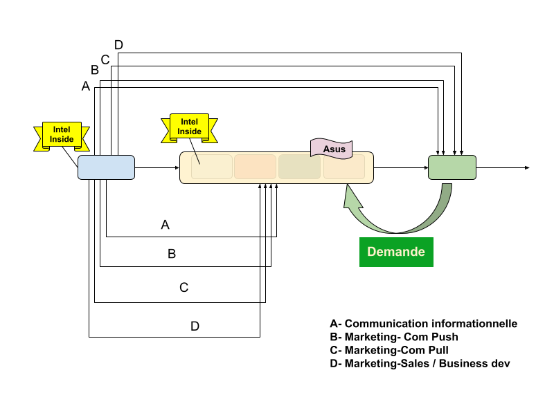 Intel crée la demande auprès des utilisateurs finaux (les particuliers et les entreprises). Les gens ne savent à quoi sert ce machin mais ont le perçu que leur ordinateur sera meilleur s’il est équipé de ce Intel!