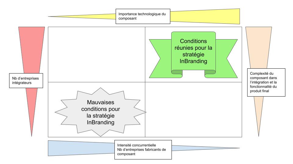 Intensité concurrentielle des intégrateurs : si au moment où l’on veut mettre en oeuvre une stratégie d’entrisme par un fort branding pour un composant, il existe de nombreuses entreprises intégrateurs*, cela signifie qu’il existe un marché final mais aussi qu’en ciblant un de ces intégrateurs (idéalement le n°2 ou 3 du marché plus ouvert à l’opportunité de battre ceux devant) on a plus de chance de gagner l’ensemble du marché en s’imposant à tous les intégrateurs