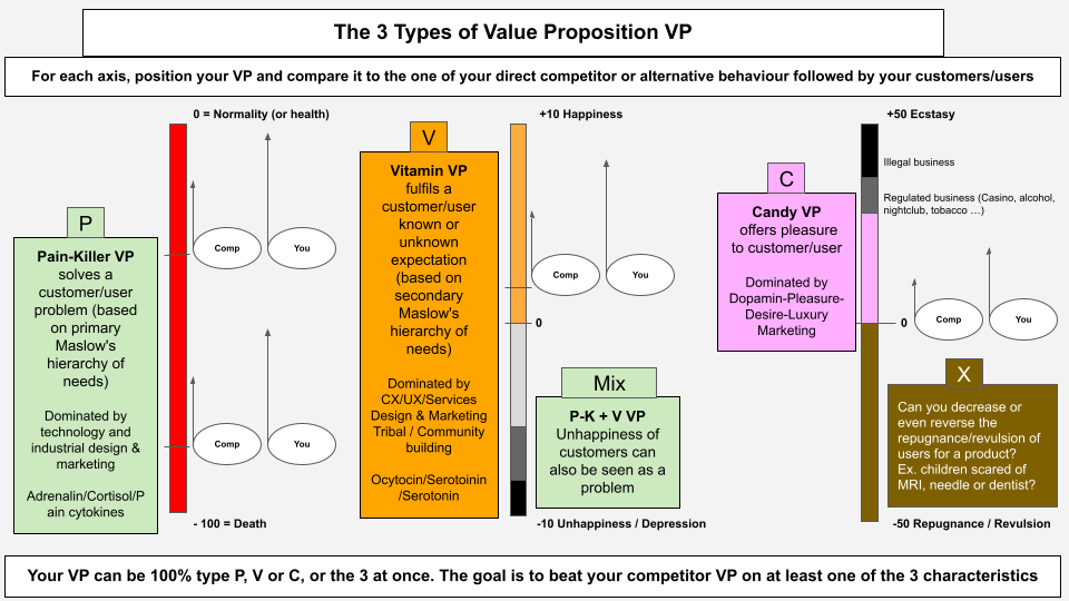 A quelques exceptions près, la grande majorité des startups et par extension leurs propositions de valeur ne sont à 100% Painkiller, Vitamin/Lifestyle ou Candy. Une des dimensions sera prédominante sur les deux autres.