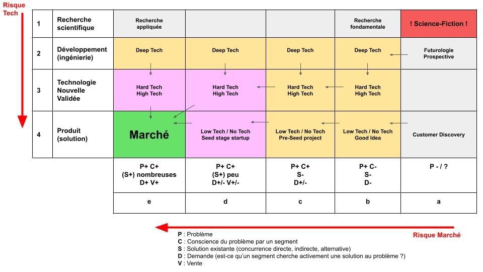 La typologie High-Tech (ou Hard Tech) consiste à prendre une technologie nouvelle validée (cad pleinement fonctionnelle, robuste, industrialisable ou scalable) et d'en faire un produit commercialisable et donc atteindre la zone verte, le Marché.